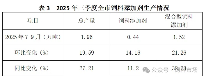 据样本企业数据测算,2025年三季度,全市工业饲料总产量 21.89万吨,环比增长0.53%,同比减少9.15%。从品种看,猪饲料产量5.25万吨,环比增长10.99%,同比增长15.41%;蛋禽饲料产量7.47万吨,环比减少1.21%,同比减少7.28%;肉禽饲料产量3.27万吨,环比减少0.89%,同比减少21.78%;水产饲料产量0.41万吨,环比减少3.16%,同比减少18.90%;反刍动物饲料产量4.07万吨,环比减少3.50%,同比减少3.26%;宠物饲料产量1.39万吨,环比减少7.98%,同比增长13.03%。2025年三季度,全市饲料添加剂总产量1.96万吨,环比增长19.59%,同比增长27.21%。