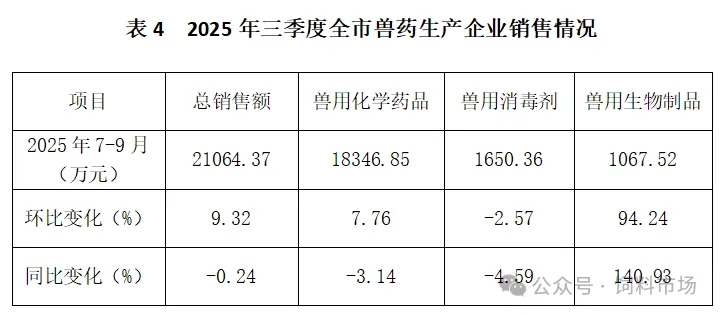 2025年三季度全市兽药产品总销售额为21064.37万元,环比增长9.32%,同比减少0.24%,其中:兽用化学药品销售额18346.85万元,环比增长7.76%,同比减少3.14%;兽用消毒剂销售额1650.36万元,环比减少2.57%,同比减少4.59%;兽用生物制品销售额1067.52万元,环比增长94.24%,同比增长104.93%。