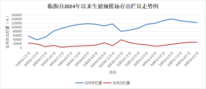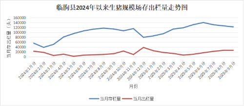 据9月份生猪规模场监测数据,临朐县143个规模场共存栏生猪123506头,比上月下降3.12%,比去年同期增加8.02%。生猪出栏27670头,比上月增加3.04%,比去年同期增加118.42%。虽然当前生猪养殖已出现亏损,但养殖场户补栏积极性很高,仔猪购买量环比增加3.47%,同比增加189.23%。仔猪购买量居高不下,导致虽然生猪出栏量持续增加,但生猪存栏仍保持高位稳定,不利于生猪价格的恢复上涨。从监测数据看,5月龄以上生猪存栏10807头,环比降低32.76%,同比降低52.11%,下一步生猪供应量将出现一定程度的下降,有利于缓解当前生猪价格的颓势。