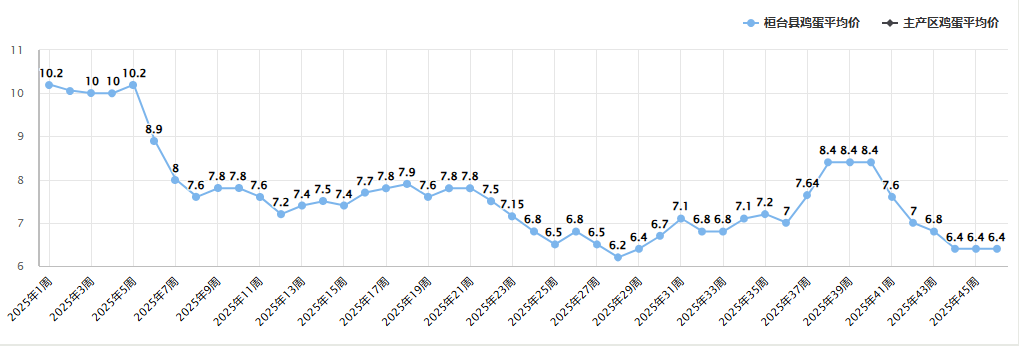 根据监测数据显示,从2025年第6周开始,鸡蛋市场价格一直呈现下降的行情走势,一度从2025年第1周的10.2元/公斤,下降到2025年第46周的6.4元/公斤,下降37.25%。通过对桓台县张氏禽业等蛋鸡养殖场的调研,目前鸡蛋的生产成本在7元/公斤左右,蛋鸡养殖已处于全面亏损状态。