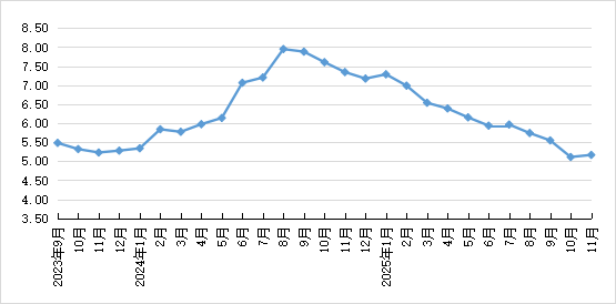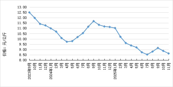 据对全国500个县集贸市场和采集点的监测,2025年11月份,牛肉、肉羊、豆粕价格环比上涨,生猪产品、鸡蛋、商品代蛋雏鸡、鸡肉、活牛、生鲜乳、玉米、育肥猪配合饲料、肉鸡配合饲料价格环比下降,商品代肉雏鸡、蛋鸡配合饲料价格环比持平。按集贸市场监测口径,本月猪粮比价为5.16:1,比上月上涨0.05个点。
