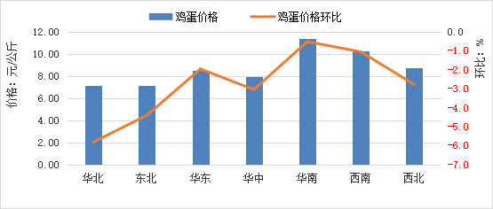 全国鸡蛋平均价格8.63元/公斤,同比跌22.7%,环比跌2.7%。河北、辽宁等10个主产省份鸡蛋平均价格7.12元/公斤,同比跌29.7%,环比跌4.6%。从涨跌情况看,上海价格上涨,河北、天津、山西、甘肃、河南等29个省份价格下跌。其中,华北地区环比跌幅较大,河北领跌,跌幅为6.8%。从价格水平来看,华南地区鸡蛋平均价格最高,为11.38元/公斤;华北地区最低,为7.13元/公斤。