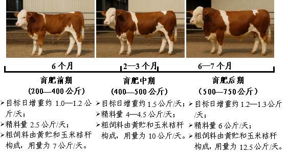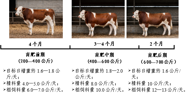 安徽牧丰农业科技有限公司养殖有西门塔尔牛5000头,采用三阶段育肥方案,各阶段精饲料由玉米、豆粕、棉粕、DDGS等组成,粗饲料以全株玉米青贮、白酒糟、作物秸秆及果渣为主。育肥前期(200—400公斤)重点促进骨架生长和体躯扩张,目标日增重1.6—1.8公斤,时间约4个月,精料日喂量平均约4.0—5.0公斤,粗饲料饲喂量6.0—7.0公斤。育肥中期(400—600公斤),目标日增重维持在1.8—2.0公斤,时间约3—4个月,精料用量提高至平均约8.0公斤/天,粗饲料约10.0公斤/天。育肥后期(600—700公斤),目标日增重1.6公斤,时间约2个月,精料进一步提高至平均约10公斤,粗饲料约12—13公斤/天。