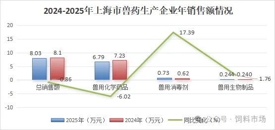 2025年全市兽药产品总销售额为8.03亿元,同比减少0.86%,其中:兽用化学药品销售额6.79亿元,同比减少6.02%;兽用消毒剂销售额0.73亿元,同比增涨17.39%;兽用生物制品销售额0.24亿元,同比增长1.76%。