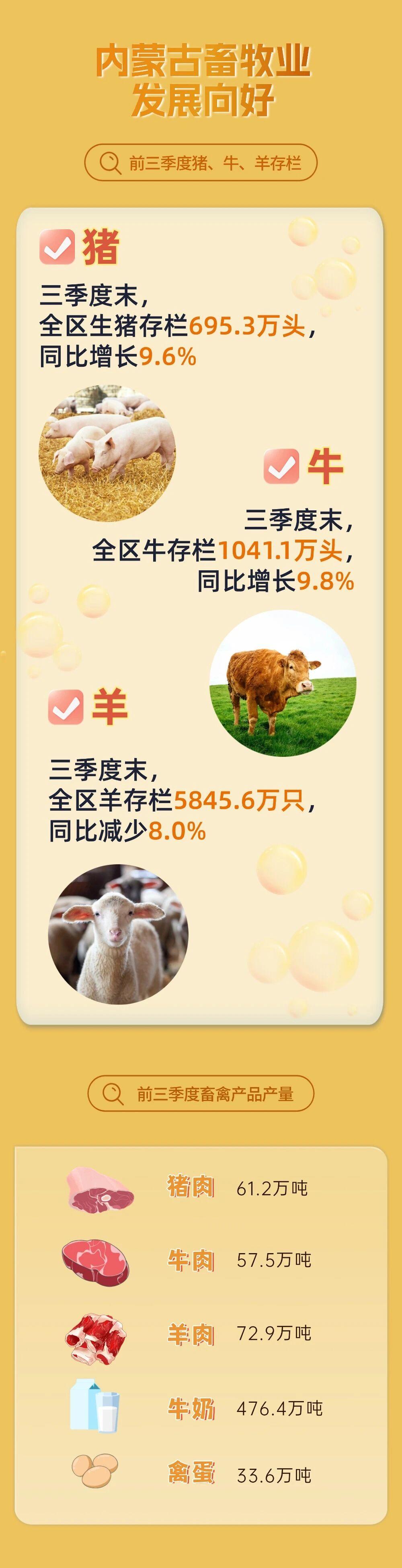 前三季度,内蒙古畜牧业生产平稳增长,猪牛羊禽肉产量209.3万吨,同比增长5.0%。其中,猪肉、牛肉产量分别增长3.8%、11.6%,羊肉产量下降0.4%。牛奶产量增长2.2%。牛存栏1041.1万头,增长9.8%;牛出栏354.5万头,增长12.6%。
