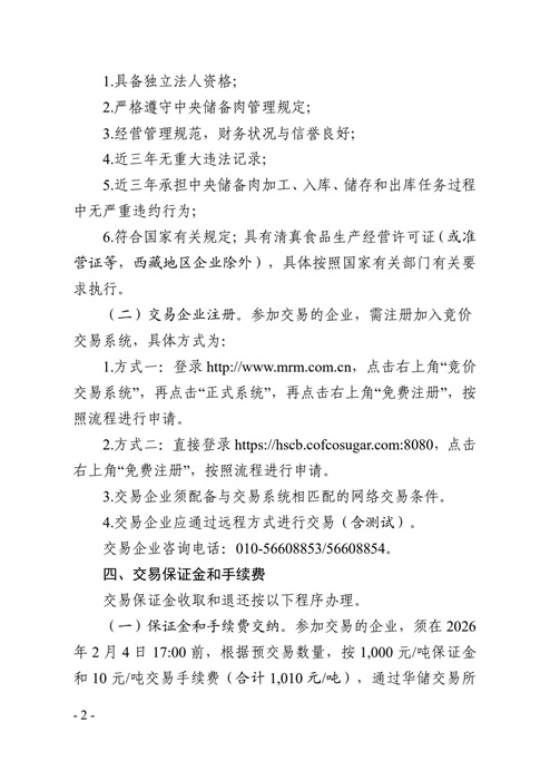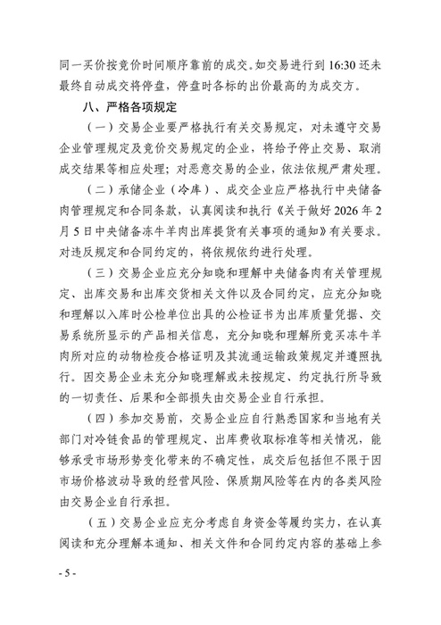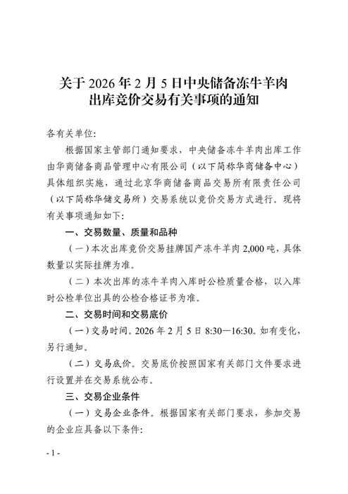 华商储备中心:关于2026年2月5日中央储备冻牛羊肉出库竞价交易有关事项的通知