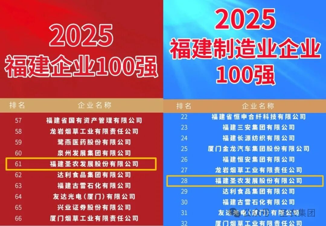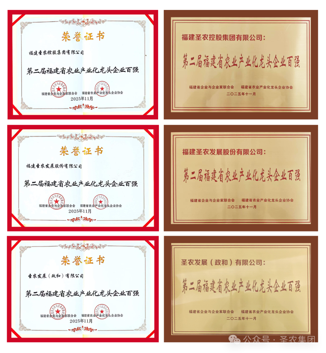 同期发布的还有“福建省农业产业化龙头企业百强”榜单,圣农集团及其旗下上市公司圣农发展、圣农发展(政和)有限公司共同入选,荣膺“福建省农业产业化龙头企业百强”称号。