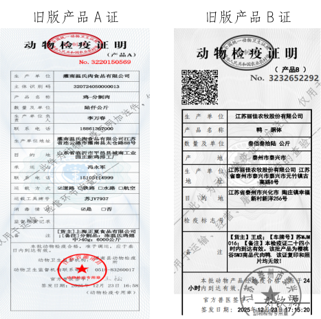 近期,农业农村部印发《关于加强动物检疫证章标志管理工作的通知》(农牧发〔2025〕8号),对动物检疫证章标志的种类、样式以及使用管理进行了调整和规范。2026年1月1日起,启用新版动物检疫证章标志。动物检疫证明方面,产品A证、产品B证合并为产品证,调整后的动物检疫证明分为动物A证、动物B证、产品证。同时,不再对屠宰环节分割的动物产品出具检疫证明。动物检疫标志方面,启用新版卡环式和粘贴式检疫验讫标志,不再使用动物产品小标签;启用无害化处理专用章,替代原有的“高温”“销毁”章。