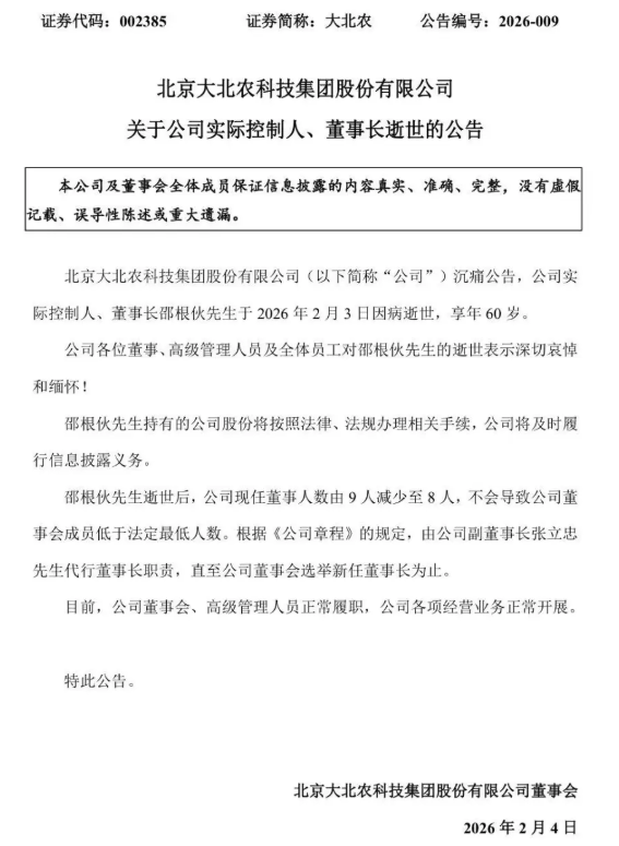 北京大北农科技集团股份有限公司(以下简称“公司”)沉痛公告,公司实际控制人、董事长邵根伙先生于2026年2月3日因病逝世,享年60岁。