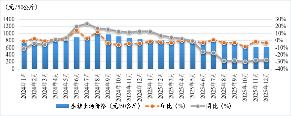 12月份,全区生猪出场价格呈波动回升态势,由于是下半月低位回升,因此月度价格重心仍小幅下移。12月份全区生猪平均出场价格为608.38元/50公斤,与11月份相比(以下简称环比)下降3.50%;与2024年12月份相比(以下简称同比)下降27.62%。从周监测情况看,12月3日、10日、17日、24日、31日全区每50公斤生猪平均出场价格分别为603.67元、602.90元、604.83元、600.25元、630.23元,12月第5周价格回升较为显著。