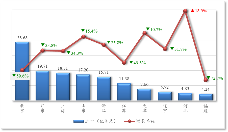 五、自美进口前十位省市中,仅河北实现增长,其余省市进口额均显著下降