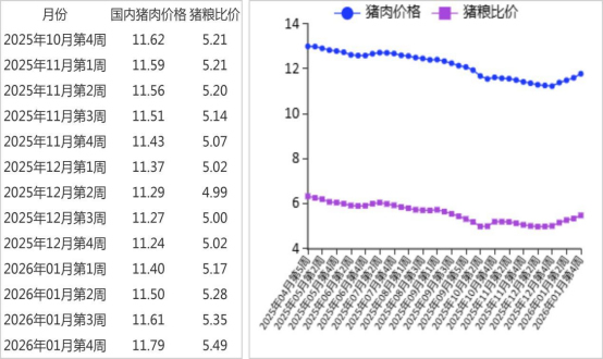 能繁母猪数量和仔猪供应量减少,规模养殖场看涨下半年生猪市场行情,部分开始采购仔猪,支撑仔猪价格上涨。据农业农村部数据,2025 年 1—12 月累计,规模以上生猪屠宰企业屠宰量 4.11 亿头,同比增 18.3%,其中,12 月份屠宰量4891 万头,环比增 23.6%,同比增 11.2%。12 月份能繁母猪存栏环比减 0.4%,同比减 2.9%。1 月份猪肉集贸市场价为每公斤 23.93 元,环比涨 5.9%,同比跌 14.2%;生猪集贸市场价每公斤 12.98 元,环比涨 6.7%,同比跌 21.9%;仔猪集贸市场价每公斤 23.93 元,环比涨 2.3%,同比跌 29.6%。